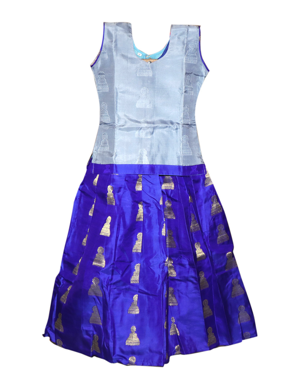 8"Yr"_Kids Pavadai Set Kanchipuram Silk Silver Grey And Royal Blue(KS8KP4)