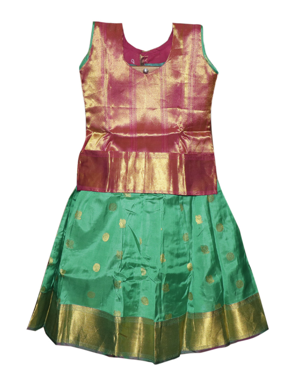 6"Yr"_Kids Pavadai Set Kanchipuram Silk Golden Pink And Green(KS6KP6)