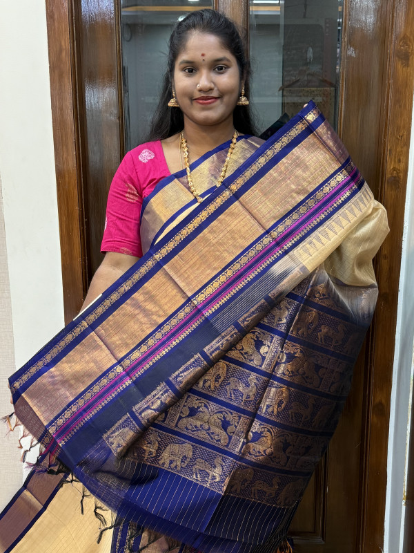 Silk Cotton Kuppadam Checked Temple Border Beige And Navy Blue(SCKCTB43)
