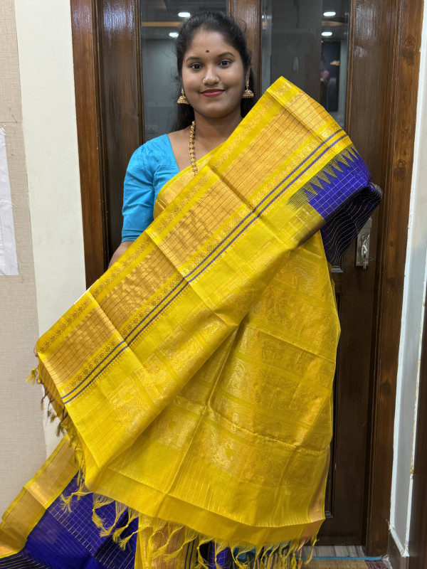 Silk Cotton Kuppadam Checked Temple Border Violet And Lime Yellow(SCKCTB45)